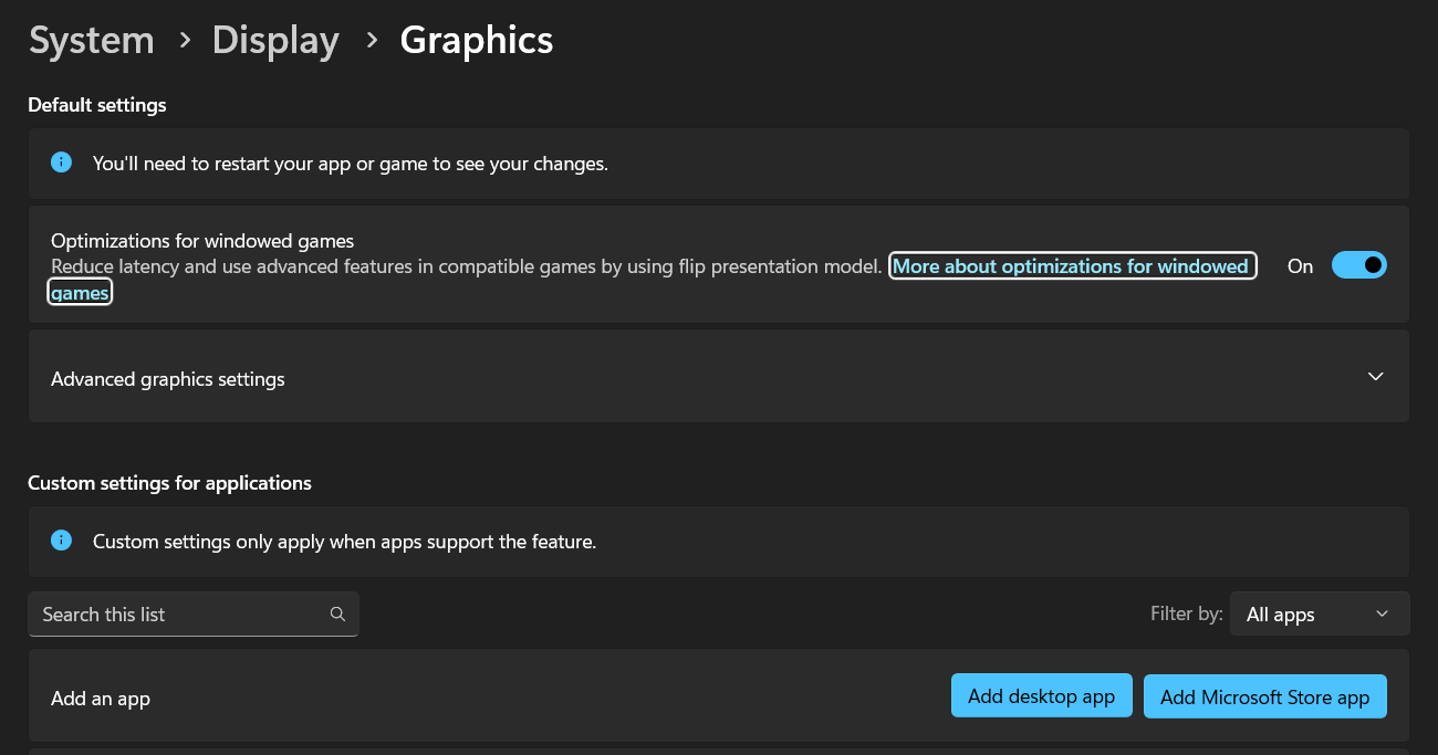 To confirm you're using the correct GPU, you'll need to navigate to the Graphics screen in Windows 11 Settings, under System > Display > Graphics. (Windows 10 instructions are at the end of the article.)