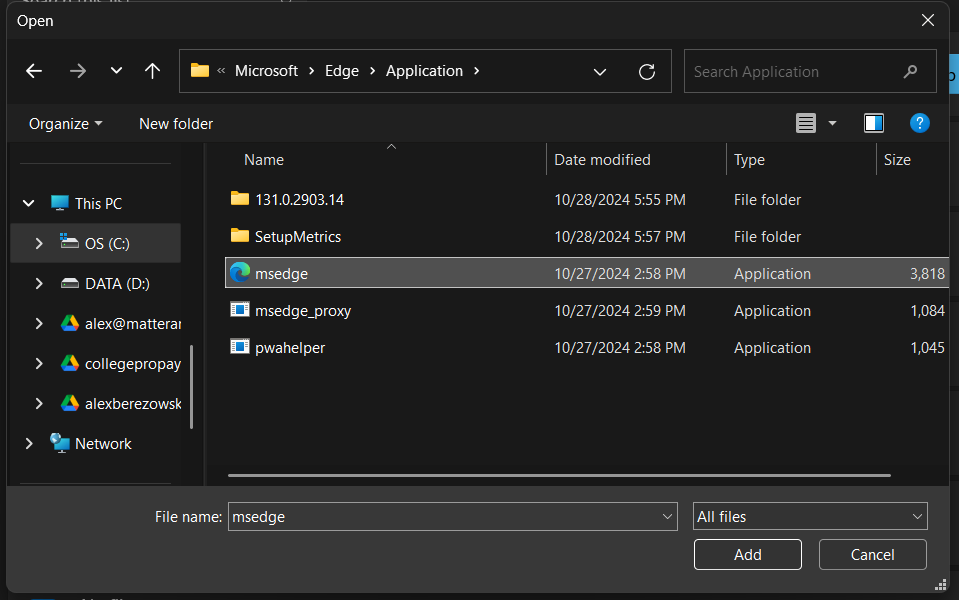 You will then need to add your browser of choice by using "Add an app"; navigate to the location of the browser executable to add it to the list. Here's an image showing the Microsoft Edge executable: